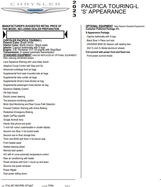 - Model: Chrysler Pacifica Touring-L S