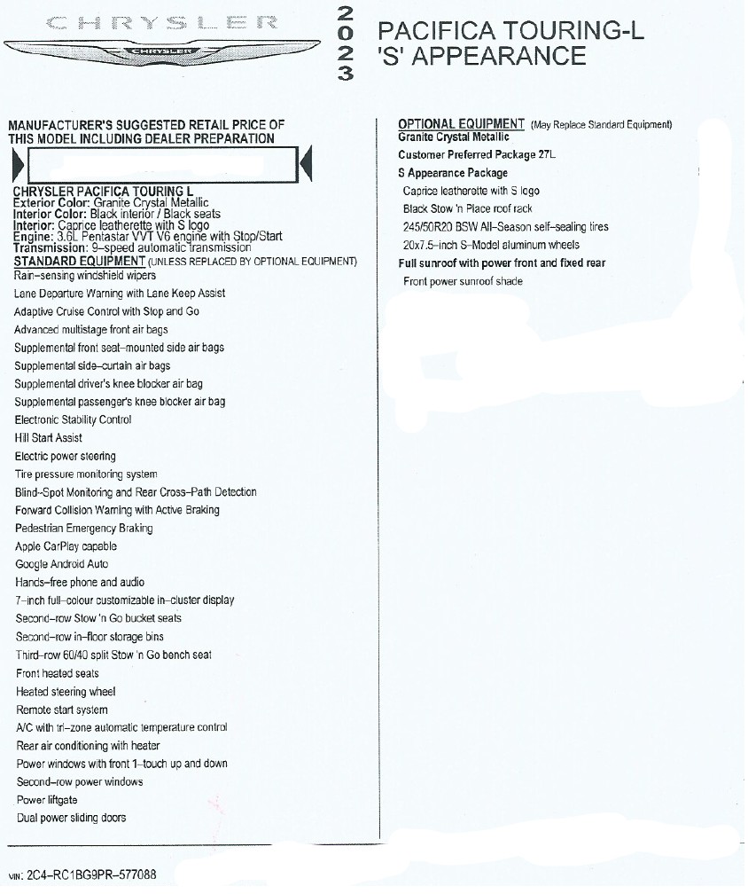 Preowned Chrysler Pacifica Touring-L S with balance of factory warranty (original in-service date: July 22, 2023)