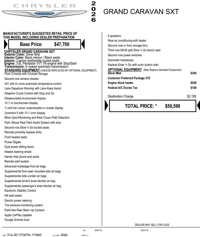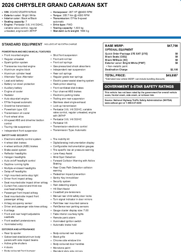 Please note: The vehicle factory window sticker shown below, does not include the administrative/documentation fees, applicable taxes or the cost of the wheelchair accessible conversion. Please contact us for total price.