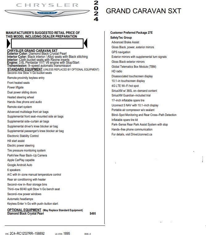 Preowned Grand Caravan has the balance of factory comprehensive warranty: expires May 31, 2027 or at 60,000 KMs (whichever comes first); Balance of vehicles factory powertrain warranty expires May 31, 2029 or at 100,000 KMs (whichever comes first).