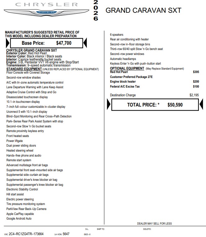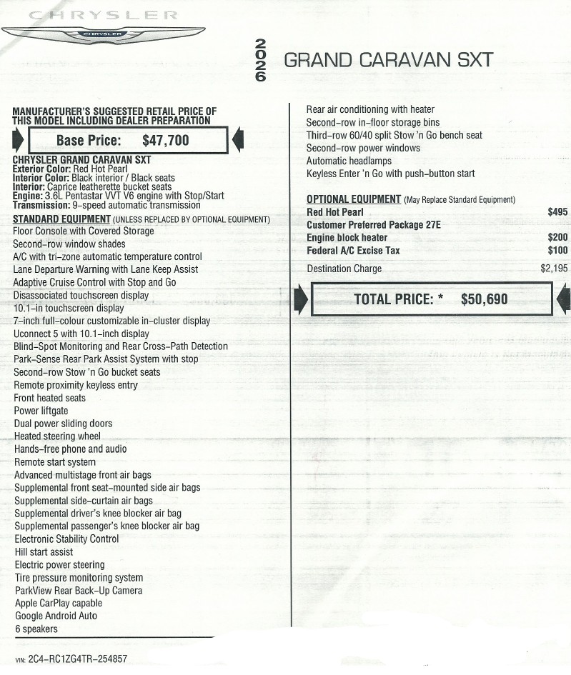 Please note: The vehicle factory window sticker shown below, does not include the administrative/documentation fees, applicable taxes or the cost of the wheelchair accessible conversion.